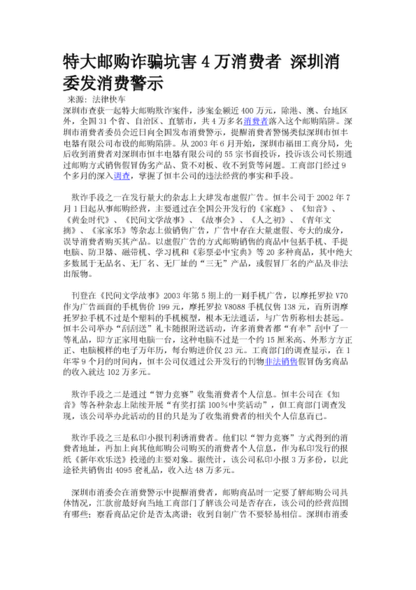 特大郵購詐騙坑害4萬消費者 深圳消委發(fā)消費警示
