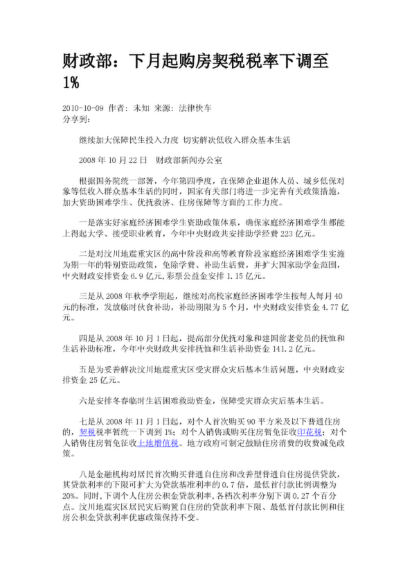 財(cái)政部:下月起購(gòu)房契稅稅率下調(diào)至1%(3.66KB)