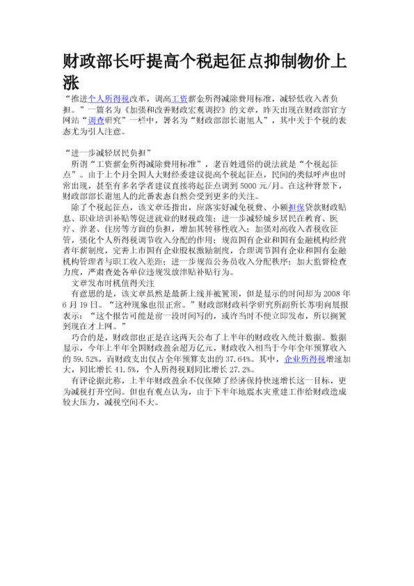 財政部長吁提高個稅起征點抑制物價上漲(19.87KB)