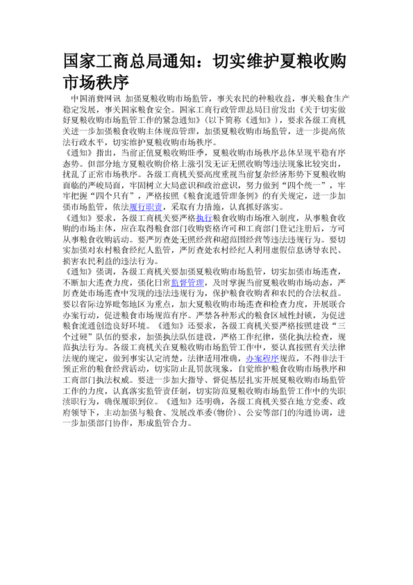 國家工商總局通知:切實維護夏糧收購市場秩序