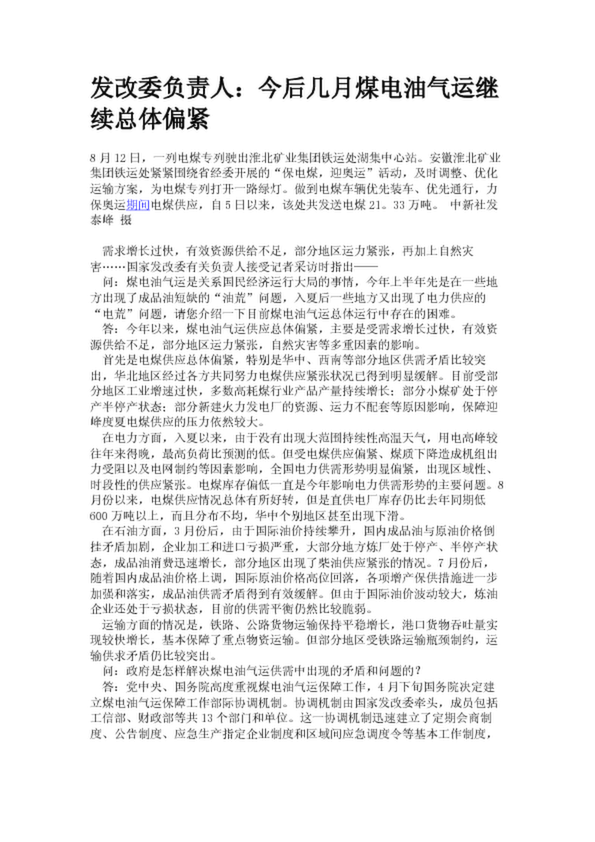 發(fā)改委負責(zé)人:今后幾月煤電油氣運繼續(xù)總體偏緊