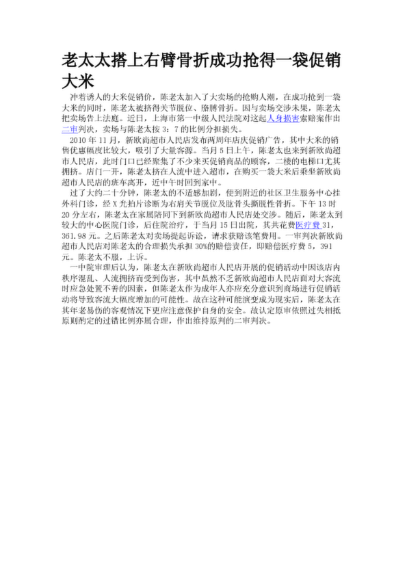 老太太搭上右臂骨折成功搶得一袋促銷大米
