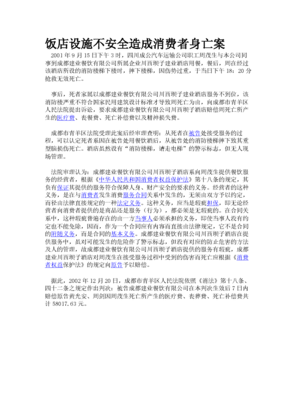 飯店設(shè)施不安全造成消費者身亡案