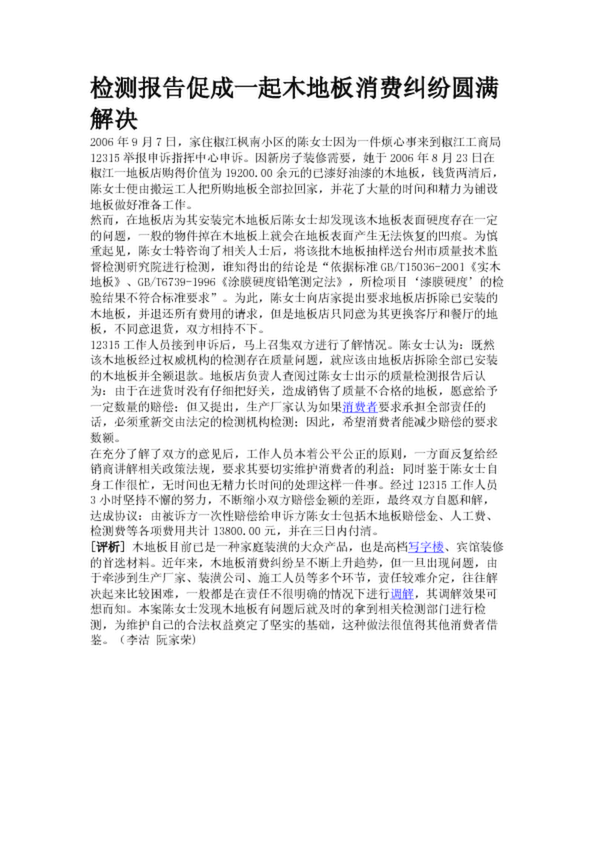 檢測報告促成一起木地板消費糾紛圓滿解決