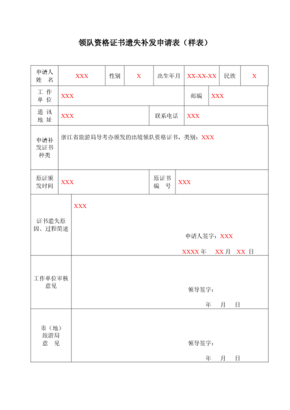 出境領隊證遺失補發(fā)申請表(樣表)