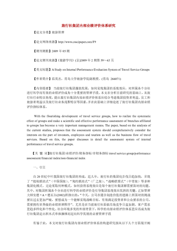 旅行社集團(tuán)內(nèi)部業(yè)績(jī)?cè)u(píng)價(jià)體系研究,,如何實(shí)現(xiàn)集團(tuán)的系統(tǒng)效應(yīng),對(duì)所屬各個(gè)分社進(jìn)行科學(xué)而有效的業(yè)績(jī)?cè)u(píng)價(jià)成為十分重要的管理手段。本文在分析目前研究的基礎(chǔ)上,從旅行社行業(yè)...