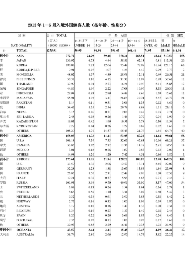 2013年1-6月入境外國游客人數(shù)(按年齡、性別分)