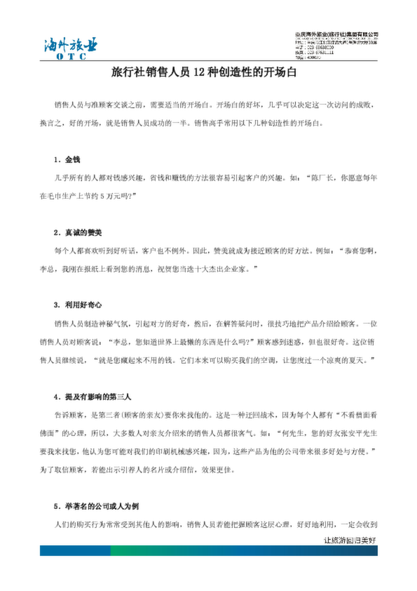 最經(jīng)典的旅行社銷售人員12種創(chuàng)造性的開場(chǎng)白,銷售員與準(zhǔn)顧客交談之前,需要適當(dāng)?shù)拈_場(chǎng)白。開場(chǎng)白的好壞,幾乎可以決定這一次訪問(wèn)的成敗,換言之,好的開場(chǎng),就是銷售員成功的一半。....