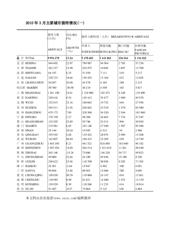 2010年3月主要城市接待情況(一)