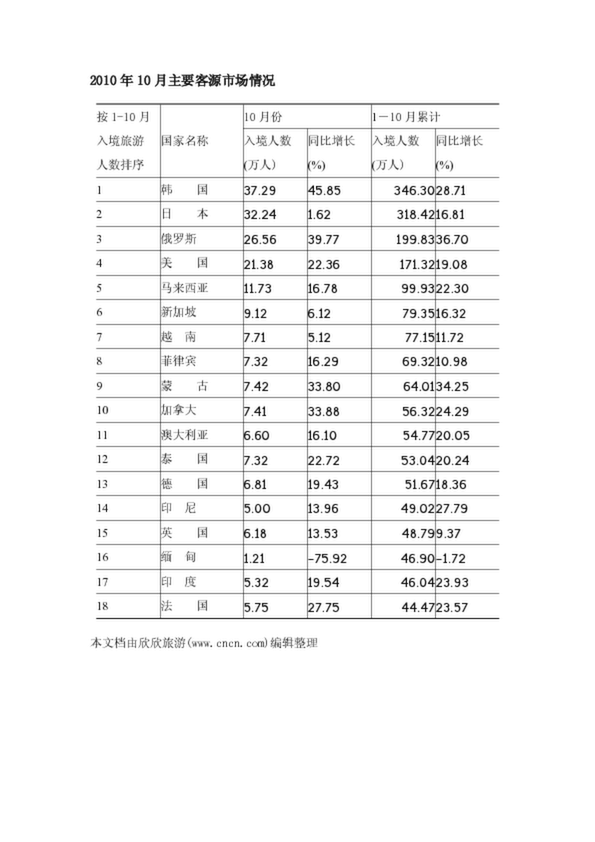 2010年10月主要客源市場情況