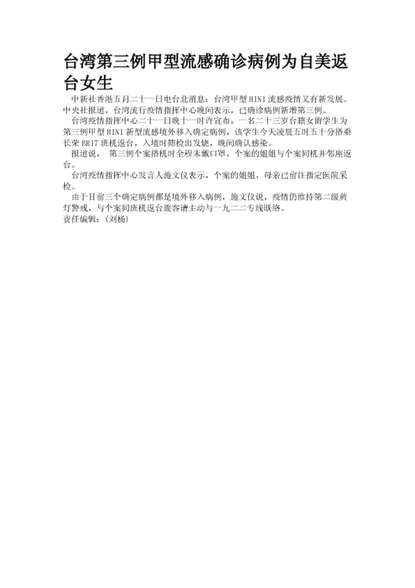 臺(tái)灣第三例甲型流感確診病例為自美返臺(tái)女生