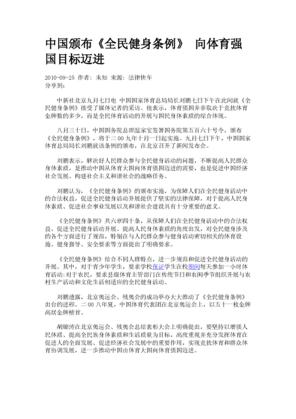 中國頒布《全民健身條例》 向體育強國目標(biāo)邁進