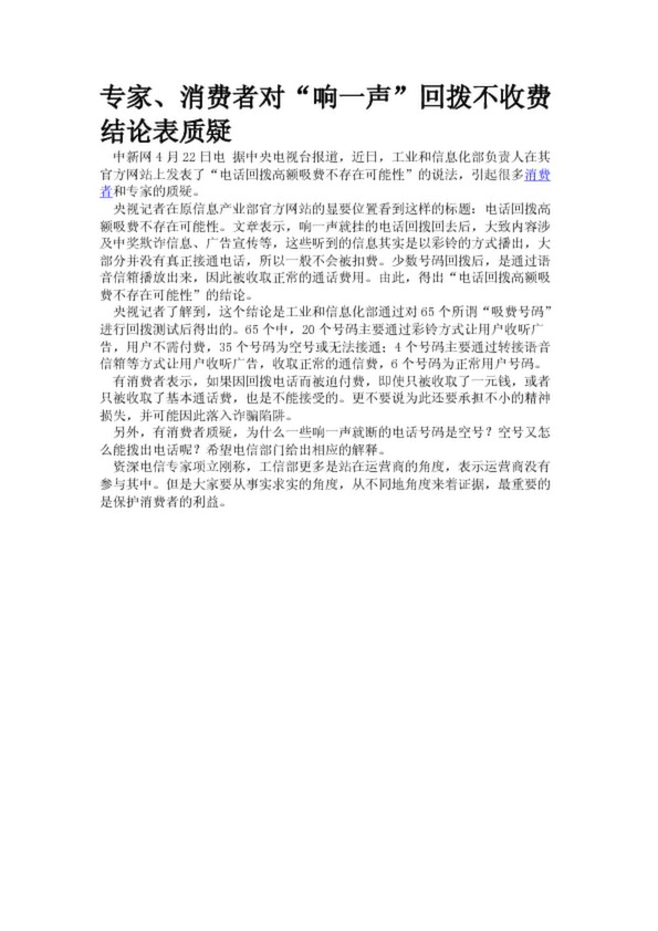 專家、消費者對“響一聲”回撥不收費結(jié)論表質(zhì)疑